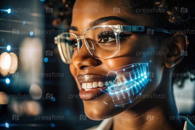 Новые технологии цифрового искусственного интеллекта в зубных протезах. Имплантаты. Чернокожая женщина-стоматолог с идеальной улыбкой и цифровой стоматологической графикой на виртуальном экране. Концепция здоровья зубов и ухода за зубами