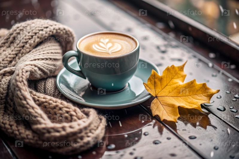 Сладкое горячее капучино в кружке с тарелкой и вязанной канавкой, шарф на деревянном столе внутри кафе. дождливый осенний день