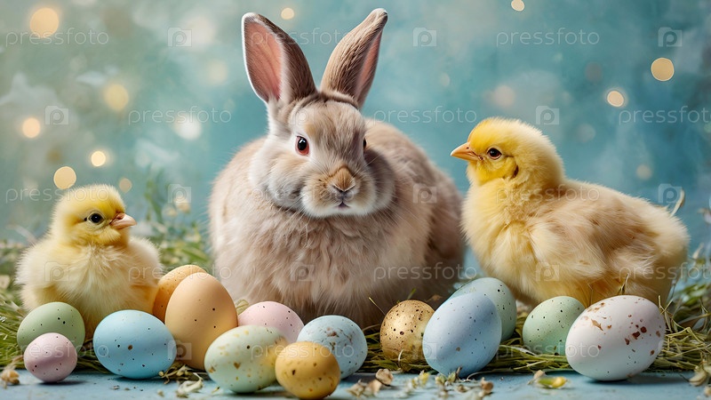 Концепция яркого пасхального праздника: нежные пасхальные яйца, кролики и куры на пастельном фоне