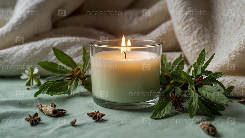 Дизайн удобно горящей стеклянной свечи с пустой белой этикеткой и зелени в интерьере дома