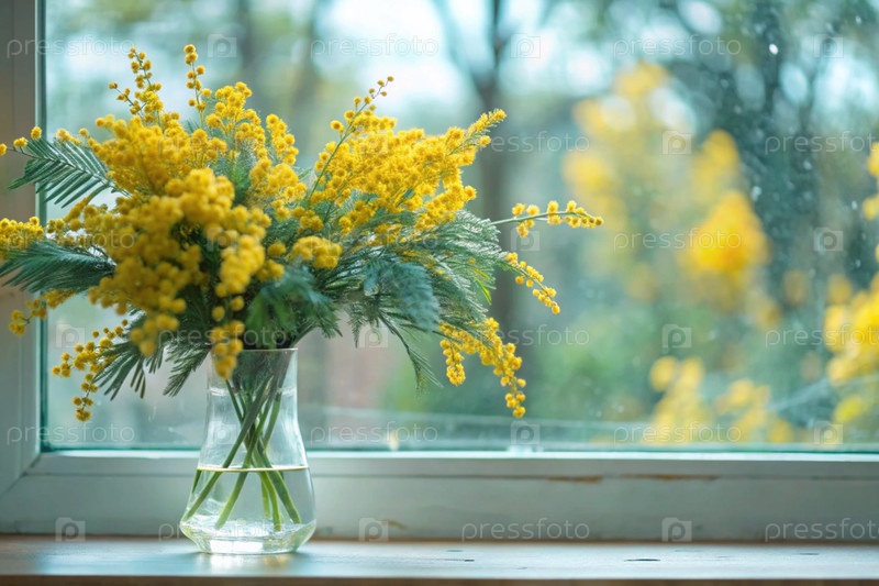 Красивый пушистый букет мимозы в вазе. Близко. Концепция домашней весны и Международный женский день 8 марта