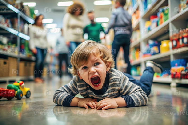 Маленький мальчик лежит на полу в магазине. Детская истерия. Ребенок кричит, плачет, становится капризным и истеричным. Недовольство