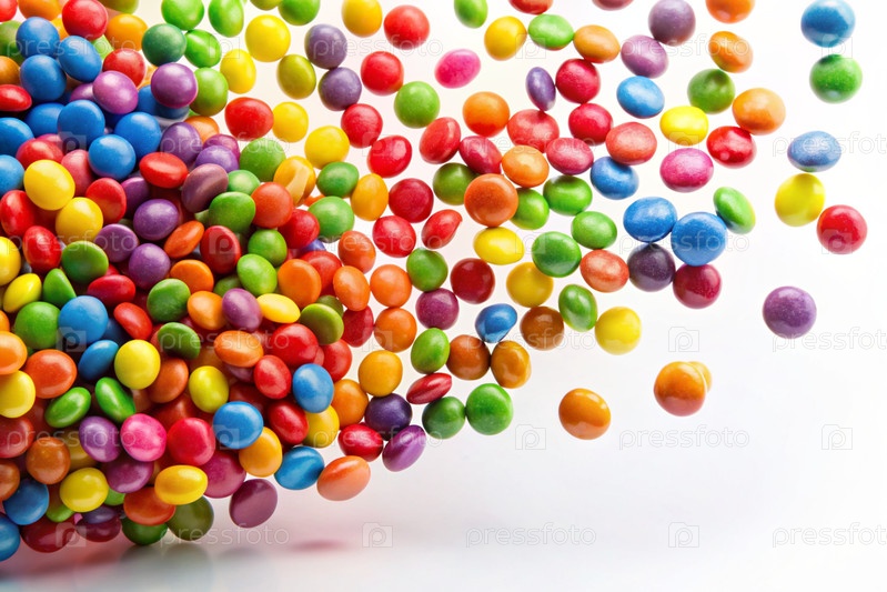 Цветные конфеты в ассортименте на белом фоне. Различные сладости, кондитерские изделия и драже различных форм и цветов. Яркие тени радуги