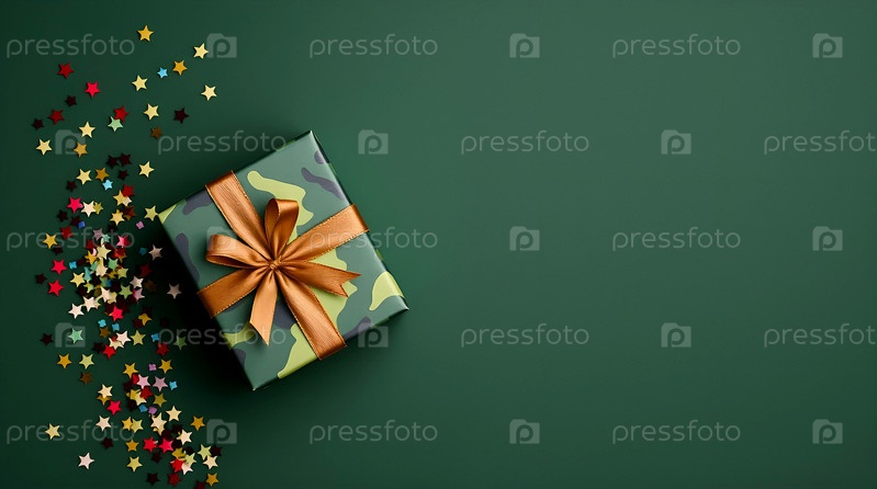 Концепция Дня защитника Отечества 23 февраля.Подарок камуфляжной коробки с праздничной сатинной лентой лука на тёмно-зеленом фоне