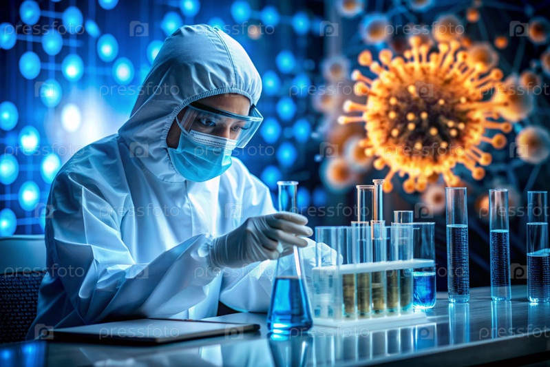 Ученый в лабораторном пальто и защитной маске осматривает трубки с светящимся вирусом в лаборатории, что символизирует продолжающуюся борьбу с инфекционными заболеваниями, важность исследований и изобретений вакцин
