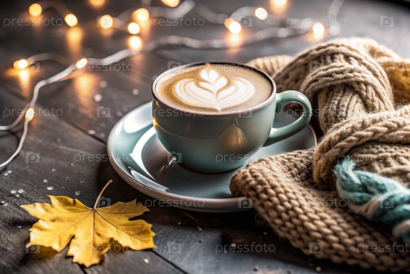 Сладкое горячее капучино в кружке с тарелкой и вязанной канавкой, шарф на деревянном столе внутри кафе. дождливый осенний день