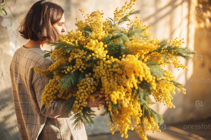Красивая девушка с пушистым букетом мимозы. Близко Концепция весны и Международный женский день 8 марта