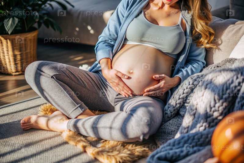 Молодая беременная женщина держит свой живот на фоне интерьера дома. Близко. Женщина готовится стать матерью. Беременность и роды