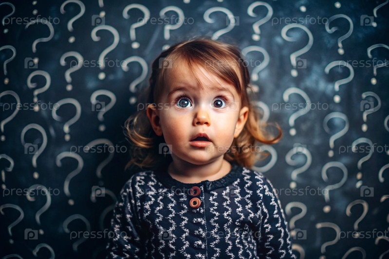 Развитие и образование детей. удивленная девочка на темном фоне с вопросительными знаками. мозговой штурм, детские вопросы и концепция идеи