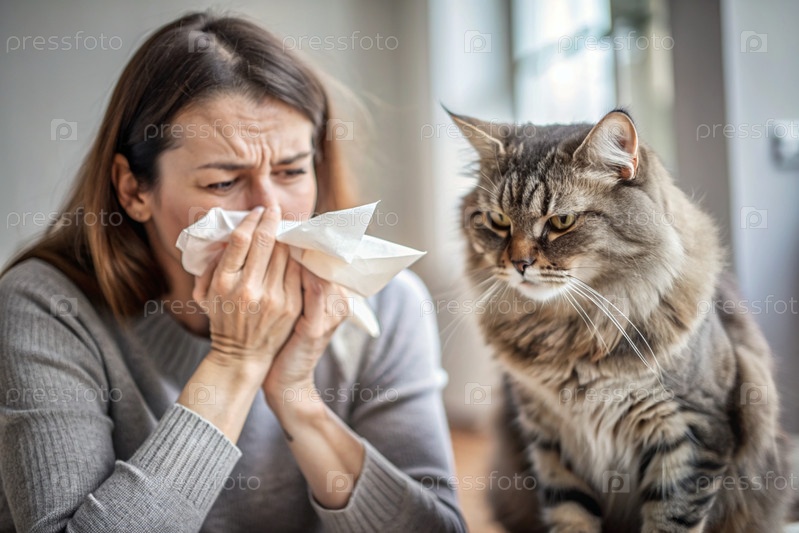 Женщина чихает в белую салфетку дома. Аллергия на волосы кошек и домашних животных. Рядом со мной кот