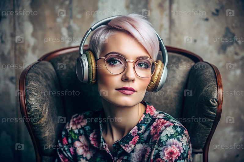 Молодая красивая девушка с розовыми волосами слушает музыку в больших беспроводных наушниках дома, на стуле в гостиной
