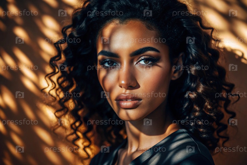 Красивый портрет афроамериканской модели на нейтральном оранжевом фоне с контрастным освещением и тенями