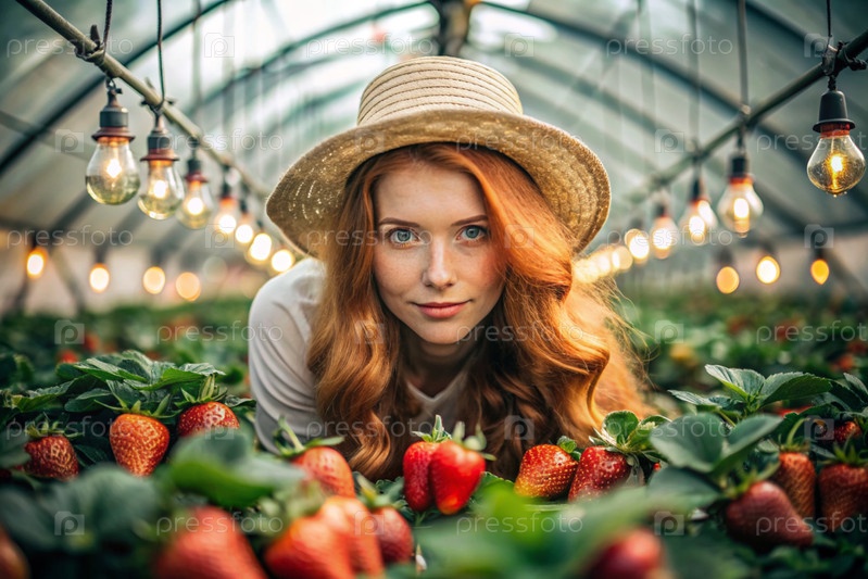 Стильный садовник в шляпе собирает богатый урожай клубники в теплице