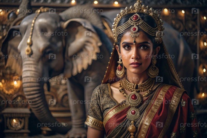 Красивая индийская девушка в традиционном национальном костюме, сари. со слонами. портрет символизирует традиции, культуру и красоту народа Индии
