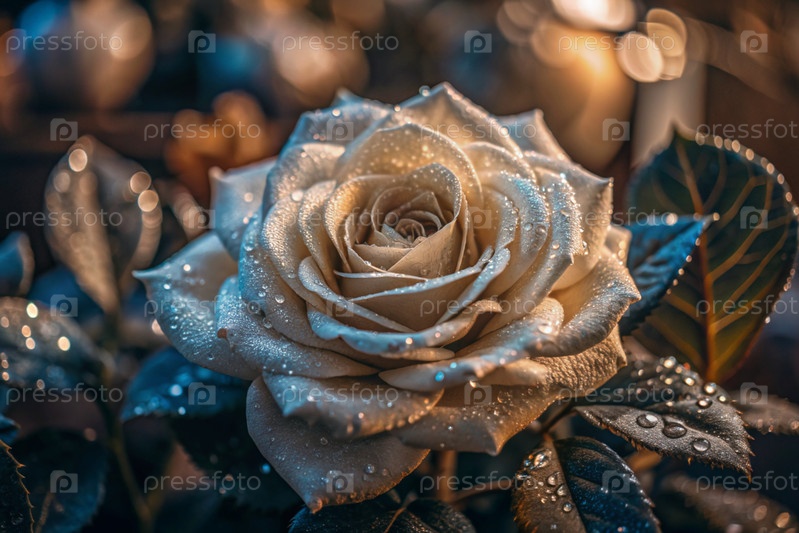 Кремовая роза красивого цвета кофе или шампанского, покрытая росой на рассвете. Красивое солнечное сияние. Фон изображения выполнен в зеленых и бежевых тонах. Естественный, экологически чистый естественный фон