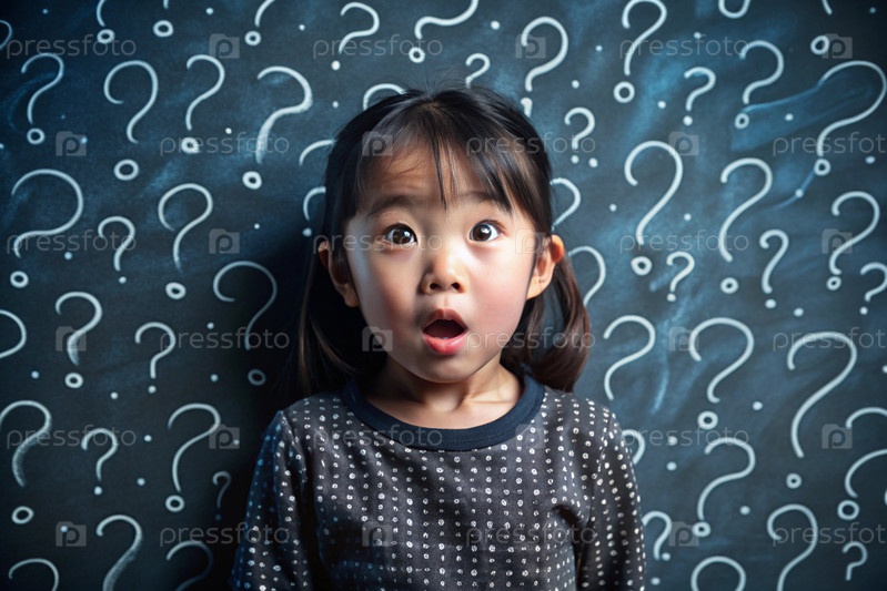 Развитие и образование детей. удивленная азиатская девушка на темном фоне с вопросительными знаками. мозговой штурм, детские вопросы и концепция идеи