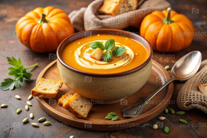 Традиционный мягкий тыквенный суп с сливками и семьями тыквы на коричнево-бежевом фоне