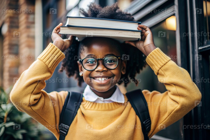 Красивая афроамериканская девушка с очками и книгами.Ребенок впервые ходит в школу.Ребёнок на свежем воздухе.Возвращение к школе
