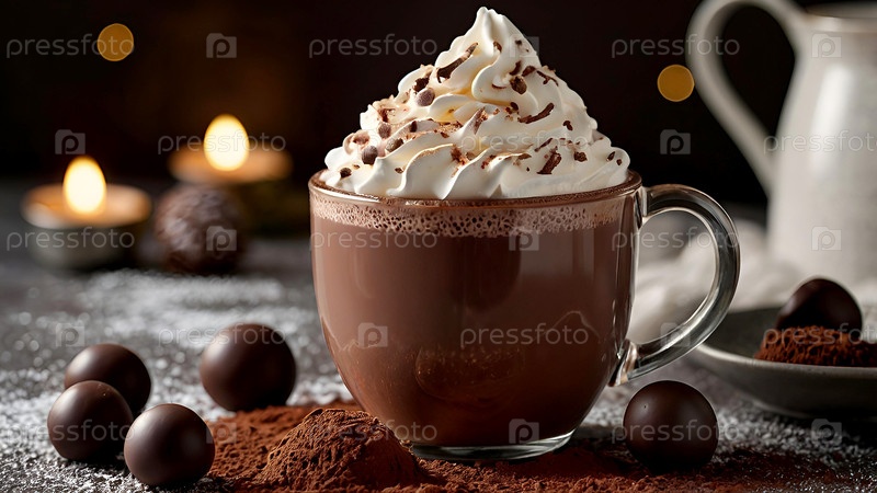 кружка горячего какао или кофе со сливкой и шоколадом. уютная фотография в мягких, теплых коричневых тонах. концепция вкуса, гармонии и комфорта
