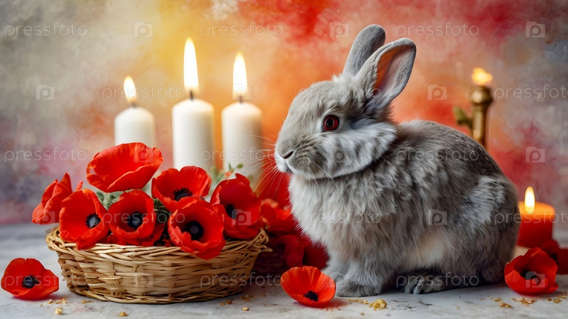 Концепция ярких пасхальных праздников - яркие пасхальные яйца в корзине из колючки, кролик и красные цветы на пастельном фоне воды