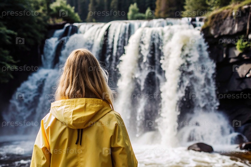 Женщина в резиновом плаще среди огромного голубого водопада. она путешествует и наслаждается жизнью и окружающей средой. туризм