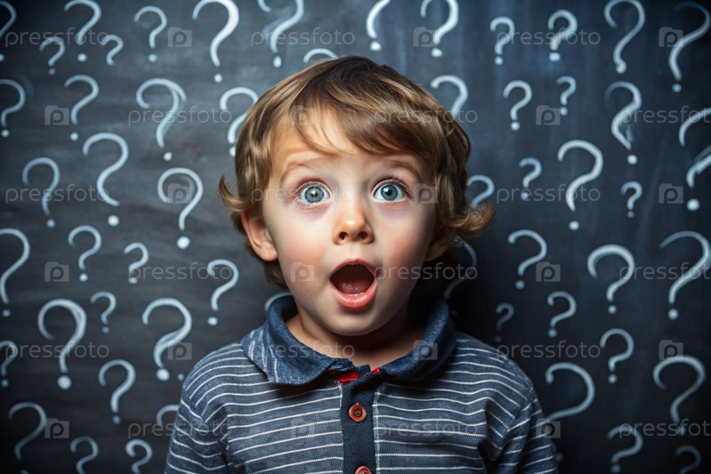 Развитие и образование детей. удивленный мальчик на темном фоне с вопросительными знаками. мозговой штурм, вопросы детей и концепция идеи