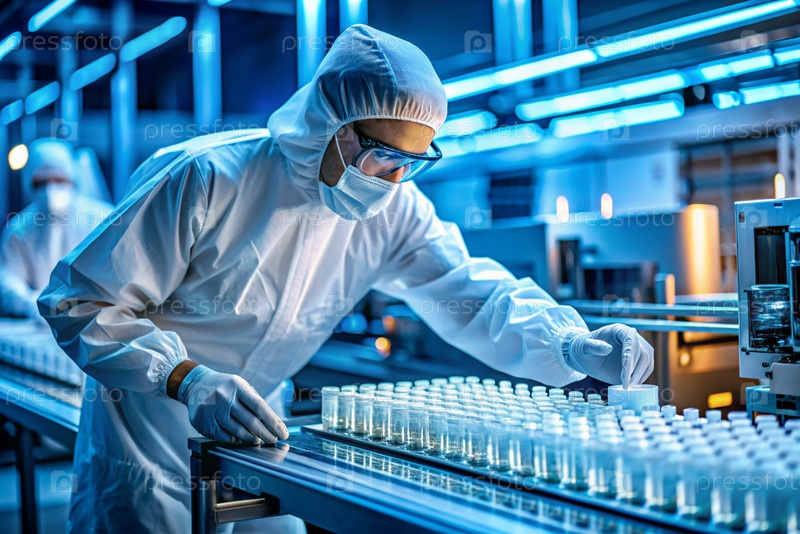 Производство лекарств: фармацевт тестирует медицинские флаконы на автоматическом трубопроводе фармацевтической производственной линии с использованием искусственного интеллекта
