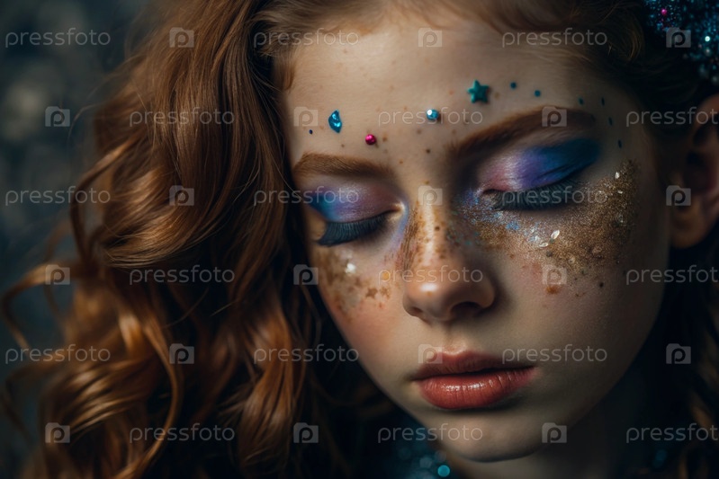 Покрытие лица девушки праздничным макияжем и ленточками.Изображение придает ей сказочный и мистический вид.Концепция новогодней ночи или дня рождения
