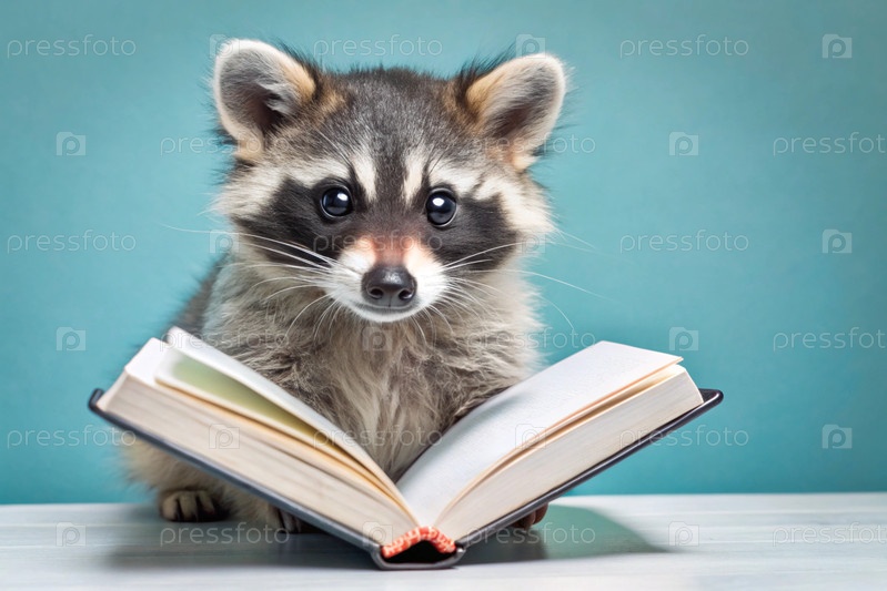 Забавный милый енот читает книгу на синем фоне