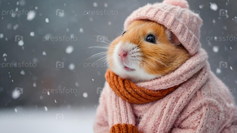 Забавный хомяк с большими щеками, одетый в уютную мягкую розовую тёплую одежду, шляпу и шарф на зимнюю тематику