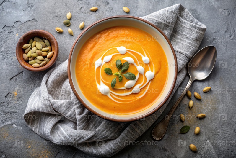 Традиционный мягкий тыквенный кремовый суп с сливками и семьями тыквы на сером бетонном фоне