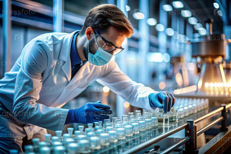 Производство лекарств: фармацевт тестирует медицинские флаконы на автоматическом трубопроводе фармацевтической производственной линии с использованием искусственного интеллекта