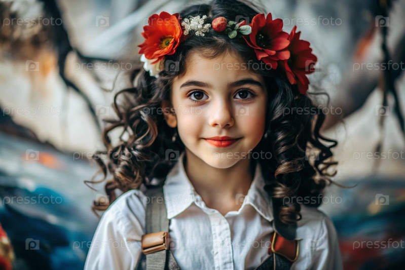 Портрет красивой маленькой кудрявой темнокожей девушки с цветочной тиарой или венком красных цветов на голове