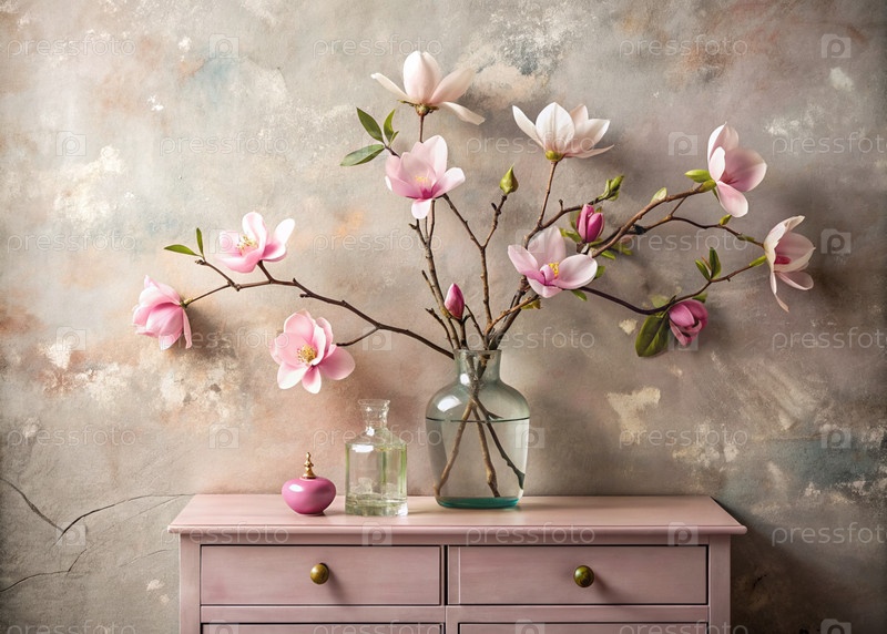 Красивая ветвь розовой магнолии в стеклянной вазе и флаконы на старом деревянном шкафу. Букет цветов в вазе в интерьере дома. Светлый, бежевый, розовый цветочный фон