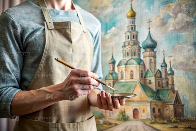 Художник рисует картину с масляными красками на холсте.На картинке изображена православная церковь, храм.Религия, творчество и отдых