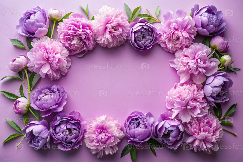 Рама с красивыми цветками пиони на пастельно-фиолетовом фоне