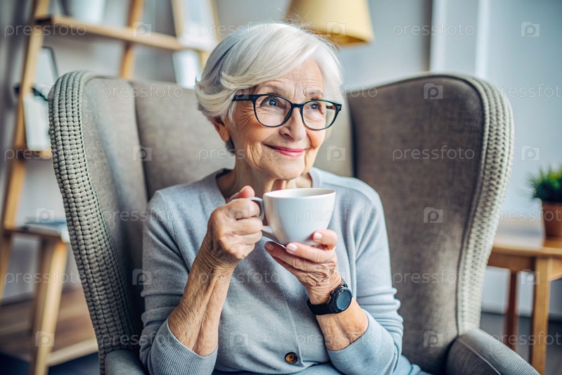 Пожилая пенсионерка, современная бабушка в очках, пьет кофе из кружки во внутренней части гостиной, сидя на стуле дома под естественным светом