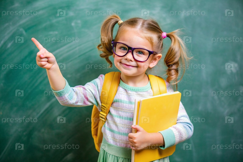 Красивая девушка в очках показывает класс своей рукой. Ребенок идет в школу впервые. Ребёнок с школьной сумкой и книгой. Ребенок в классе со доской на заднем плане. Назад в школу