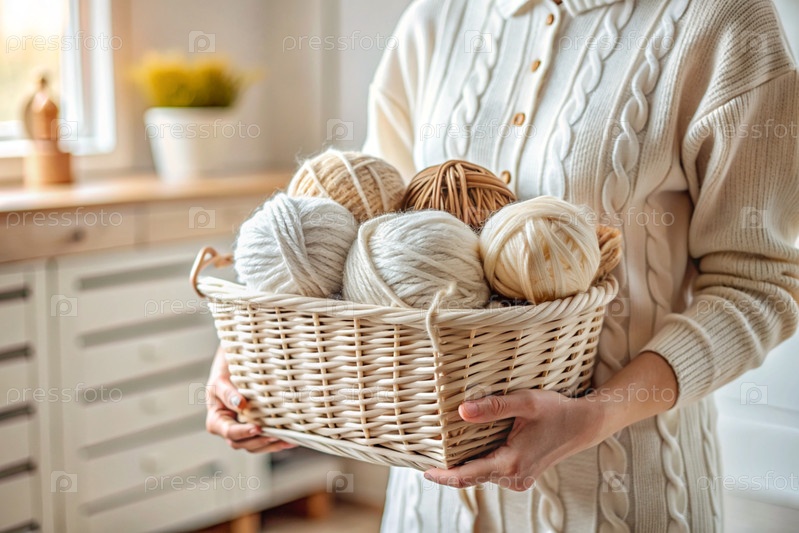 Близко. женщина с шариками пряжи в белых и бежевых тонах в руках. Игла, вязание. Зимний сезон, малый бизнес, ручная одежда