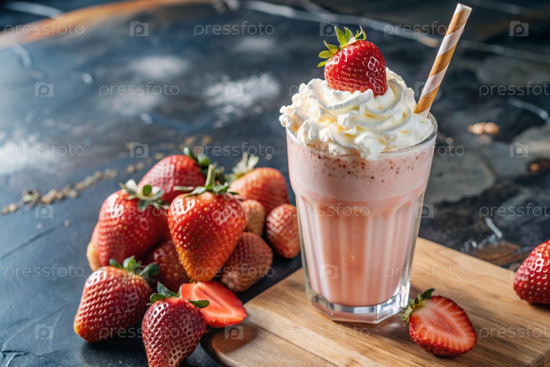 Освежающий клубниковый молочный коктейль с битой сливкой и соломой на столе, окруженном свежими ягодами