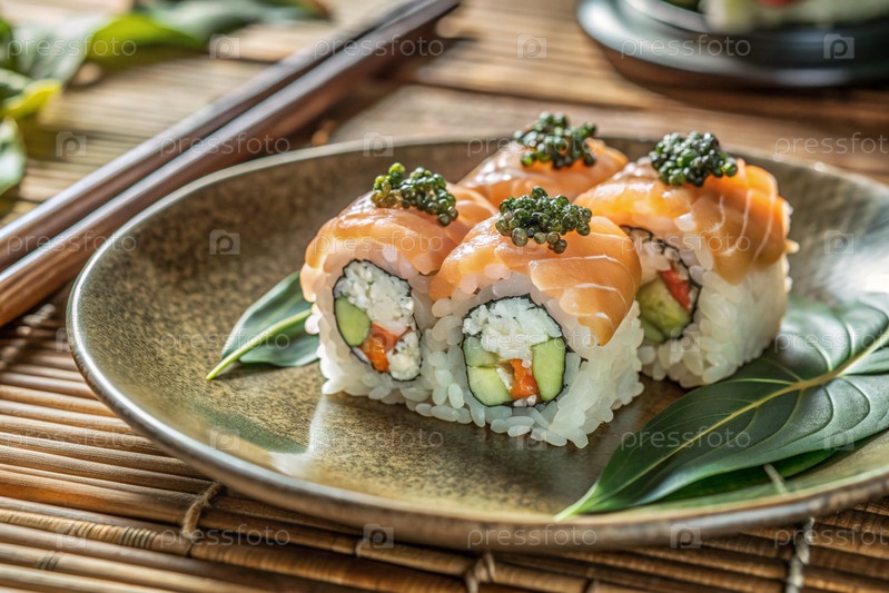 Японская еда. Суши-роллы Калифорния, Филадельфия с угорьем, красной икры и лососем. Концепция меню суши-бара