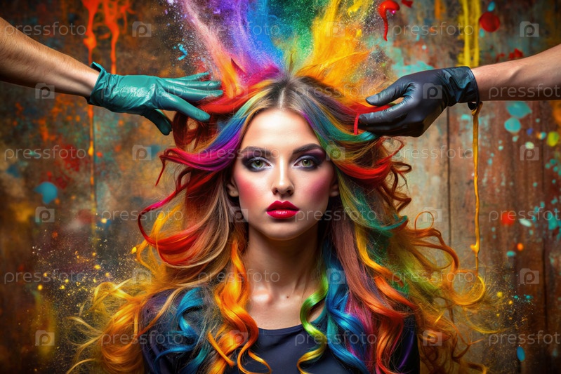 Творческий баннер для салона красоты или парикмахера. Модное профессиональное окрашивание волос. Красивая женщина с длинными многоцветными волосами. Взрыв цветов на голове