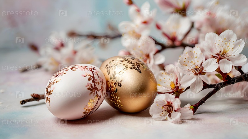 Нежные пасхальные яйца и вишневые ветви цветут на пастельном акварельном фоне с нежными полосками