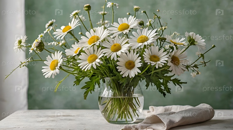 Легкий, воздушный букет маргариток в стеклянной вазе на пастельном фоне. Близко. Понятие семьи, любви и верности