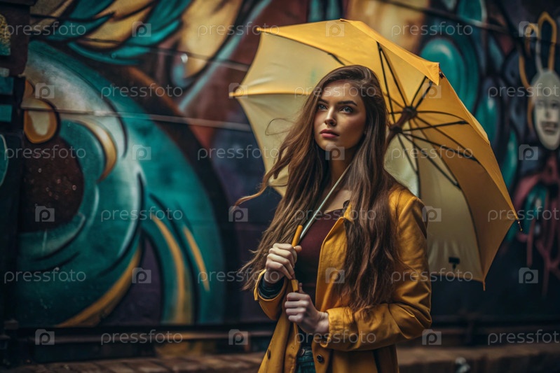 Молодая девушка в желтом плаще с зонтиком в городе на стене из граффити. Красивая молодая женщина под дождем, гуляющая по улицам города