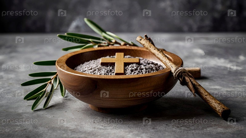 Религия, вера, литургия, Пепельная среда.Огромное заимствование: деревянный крест, церемониальная пепла и оливковая ветвь на сером фоне