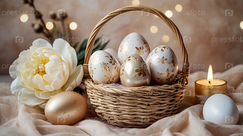 Нежные пасхальные яйца в жемчужной корзине и нежные цветы на пастельно-водном фоне