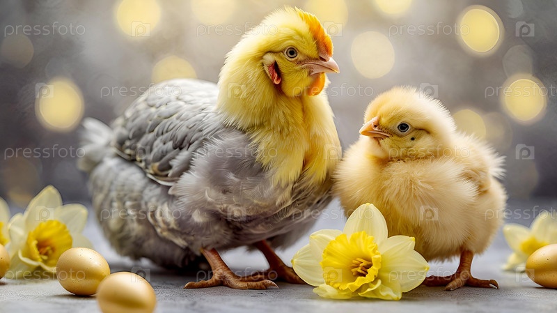 Нежные пасхальные яйца, желтые куры, цветы цыплят и нарцисс на фоне пастельного акварели с нежными венами