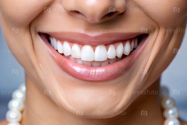 Красивая улыбка с белыми зубами. Близкий план улыбающейся женщины с натуральными полными губами и здоровой идеальной улыбкой. Концепции отбеливания зубов, стоматологического здоровья и ухода за зубами