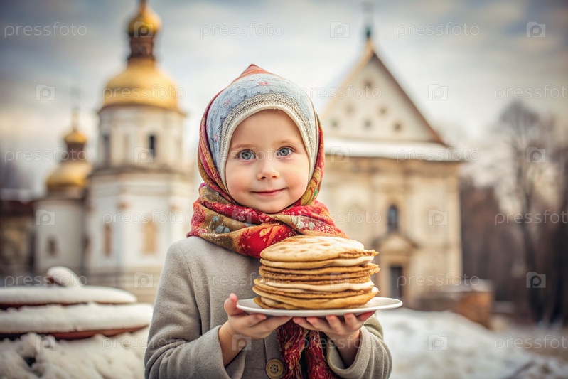 Русский праздник Масленица. Портрет девушки в русском народном платье и шарфе с блинами в руках на фоне православной церкви